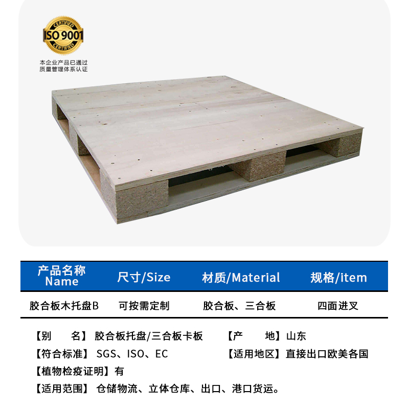免熏蒸木托盤是采用膠合板制作(膠合板屬于人造板類材料又叫三合板、復(fù)合板等),均選用厚度10~18mm的板材做為托盤原料,堅(jiān)固耐用,除可生產(chǎn)符合各國(guó)標(biāo)準(zhǔn)的產(chǎn)品外,也可根據(jù)用戶需求訂做各種尺寸托盤。