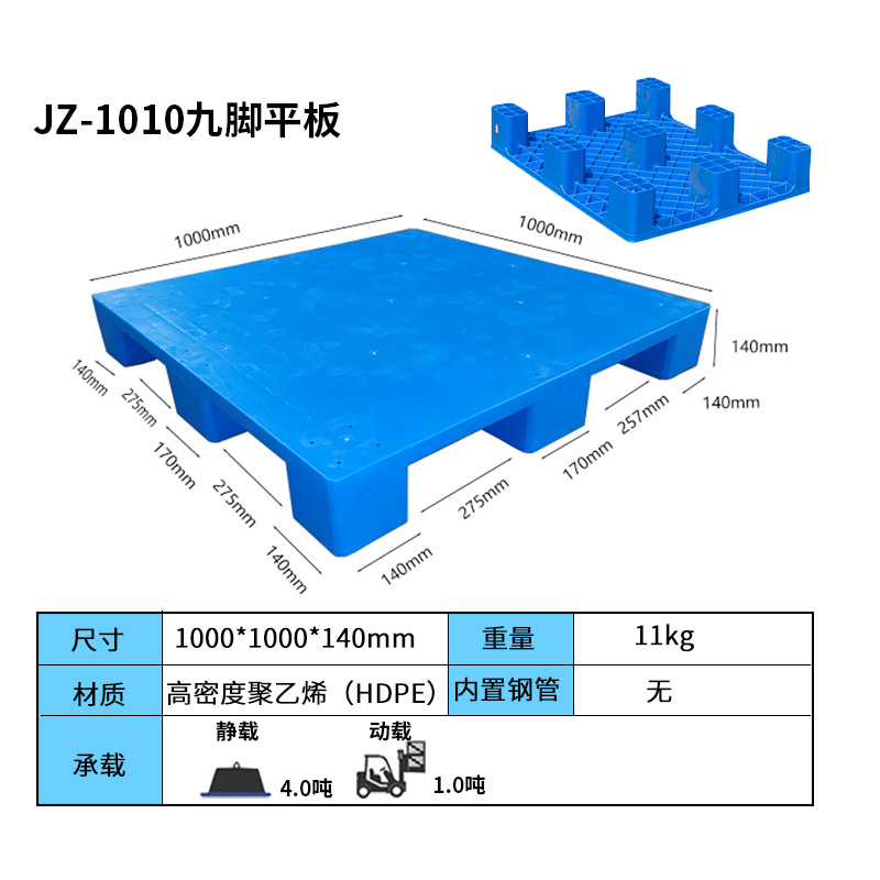 九腳平板塑料托盤(pán)底部為“九腳形”設(shè)計(jì)的塑料搬運(yùn)制品,其表面為平面,廣泛應(yīng)用于紡織廠、食品廠、醫(yī)藥廠等企業(yè)。這種托盤(pán)的設(shè)計(jì)特點(diǎn)包括輕質(zhì)、平穩(wěn)、美觀,無(wú)釘無(wú)刺,無(wú)毒無(wú)味,耐酸堿,不腐爛,不易被細(xì)菌繁殖,易清洗消毒,不助燃,無(wú)靜電,無(wú)火花,防暴,防滑溜,回收價(jià)值高。與鋼托盤(pán)、木托盤(pán)相比,九腳平板塑料托盤(pán)具有更好的環(huán)保性和安全性,能夠提升企業(yè)形象,提高物流效率。此外,九腳平板塑料托盤(pán)因其表面為平板狀,不易積累灰塵,方便清洗;受力均勻,對(duì)貨物有很好的保護(hù)作用;平面上均留有排氣小孔,具有良好的透氣性和防潮效果。這種托盤(pán)主要應(yīng)用于倉(cāng)庫(kù)輕型貨物墊倉(cāng)板、叉車(chē)周轉(zhuǎn)較輕貨物使用,不適合于上貨架或者轉(zhuǎn)載大重量的貨物?