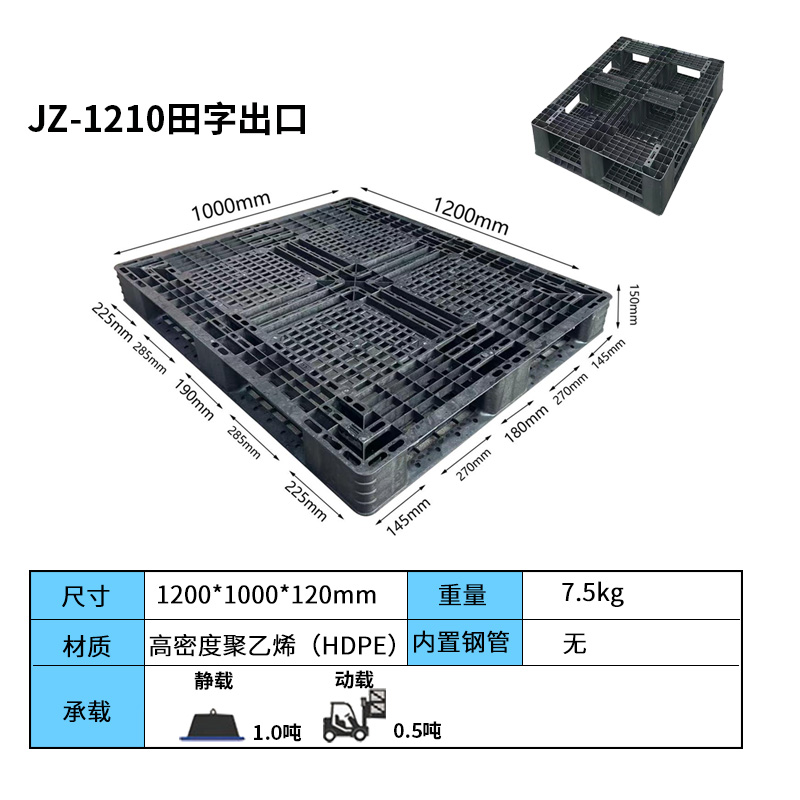 田字設(shè)計,雙層加強受力,增加托盤受力強度,使受力更加均勻,結(jié)構(gòu)牢固,不易變形。出口使用,尺寸完全貼合集裝箱,免熏蒸,免檢驗完美無障礙平地堆碼,疊放易于整理存放,也可節(jié)約存儲空間,符合空間資源合理配置要求??伤南蜻M叉,操作方便,多面進叉可防止